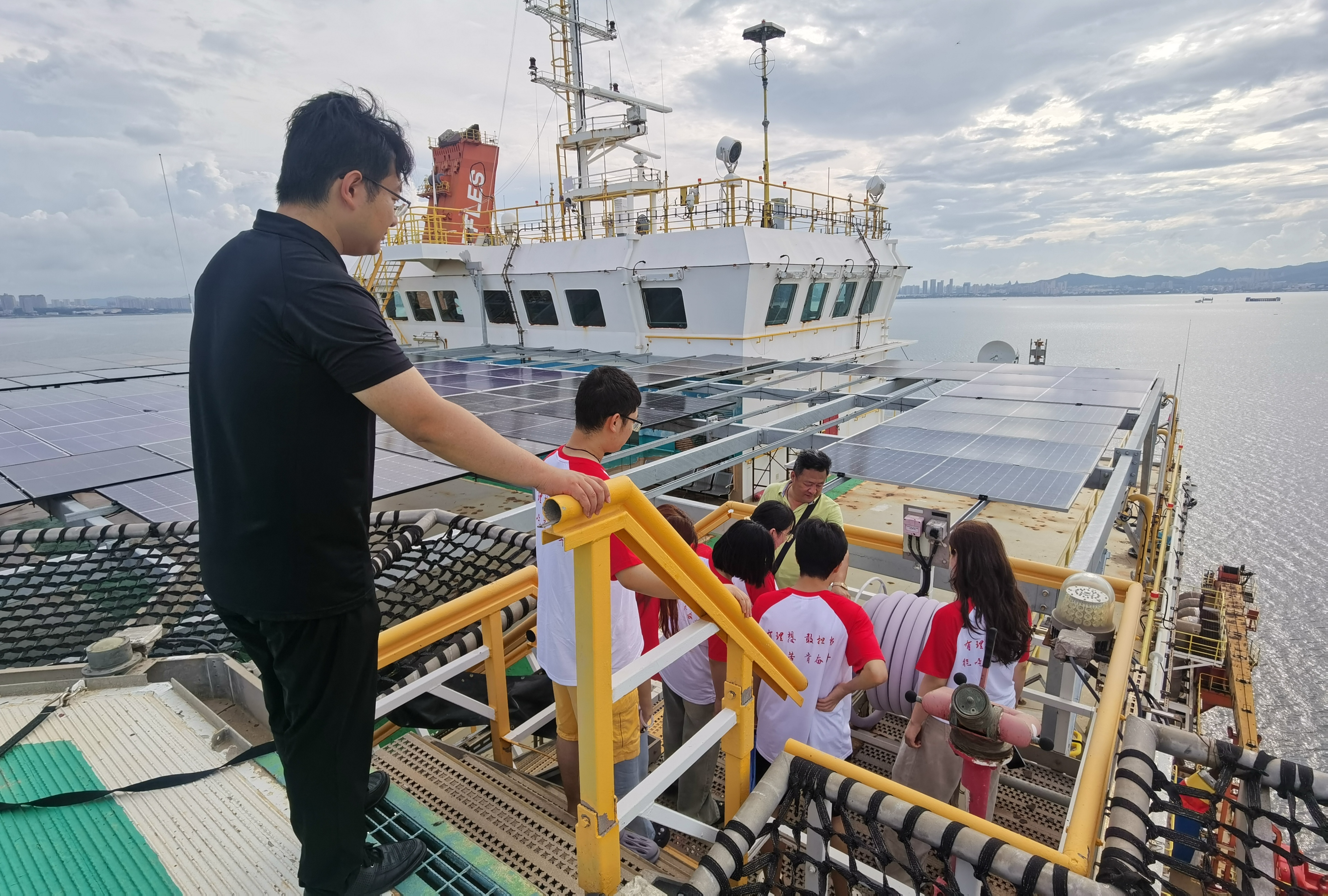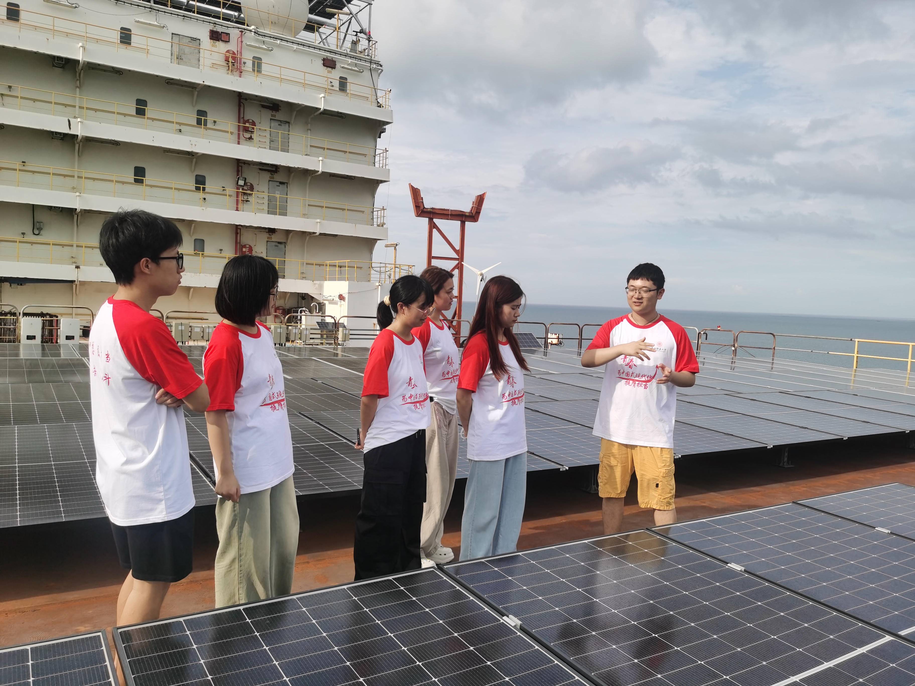 实践队来到这里,看到一排排整齐的光伏板设置在海面上,源源不断地将太阳能转化为清洁电力。海上光伏利用广阔的海洋空间,具有不占用陆地资源、发电效率高等优点。